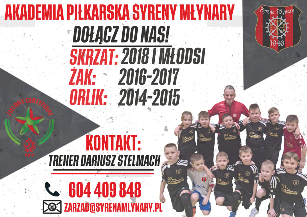 akademia syreny młynary zaprasza chętne do dołączenia dzieci w różnym wieku. w tym celu prosimy o kontakt z naszym koordynatorem drużyn młodzieżowych, trenerem dariuszem stelmachem tak jak na poniższym plakacie:
